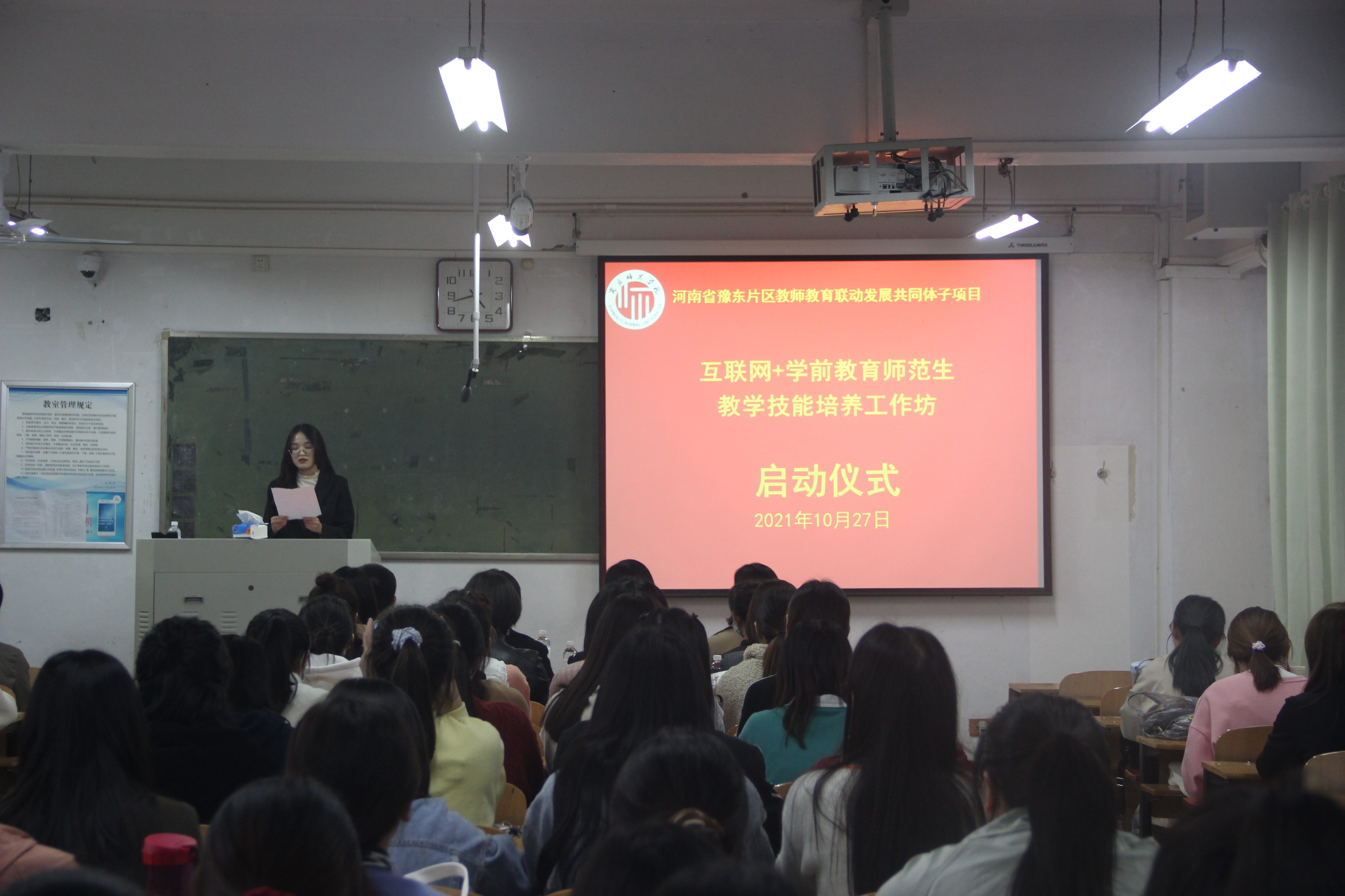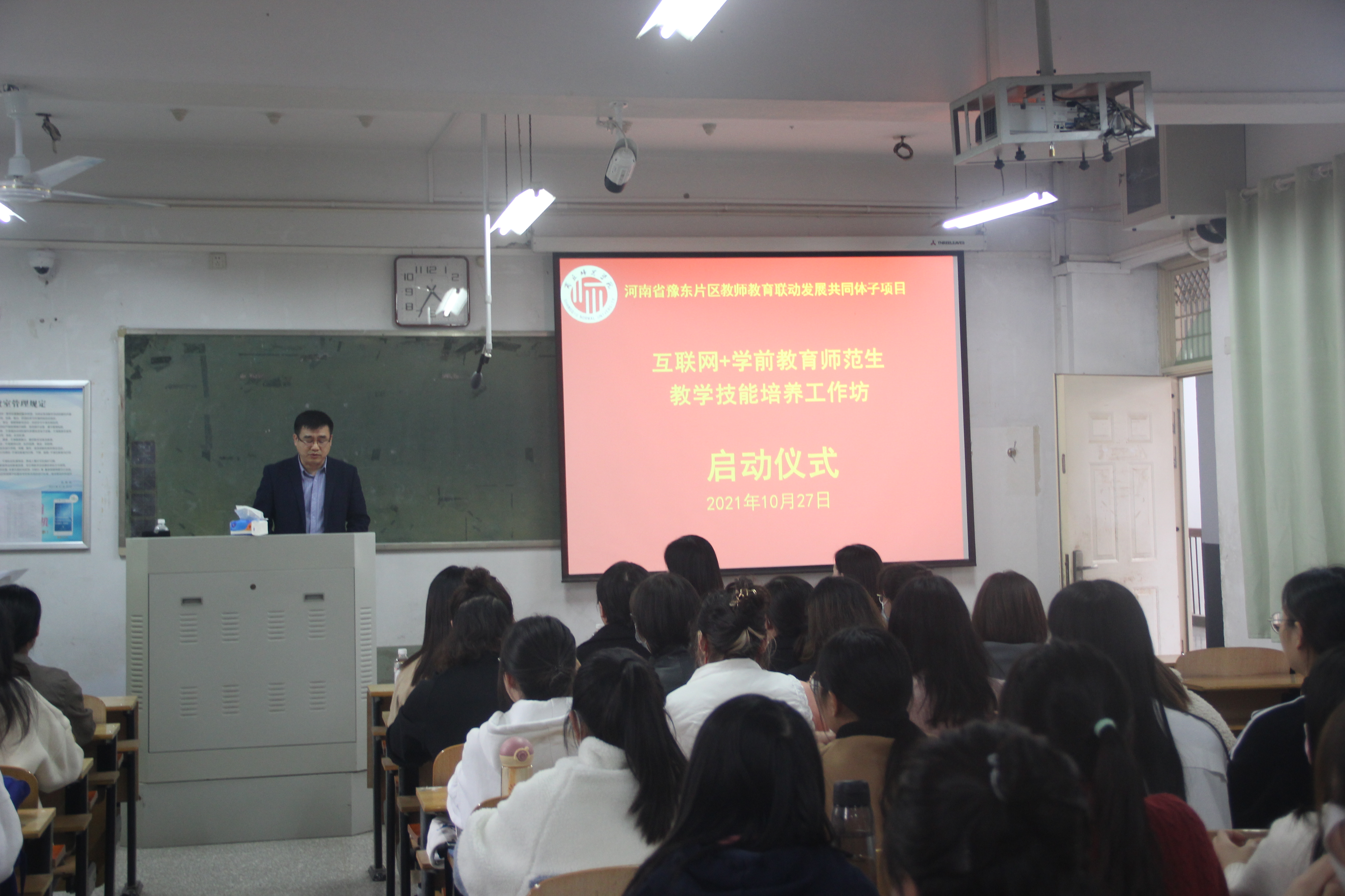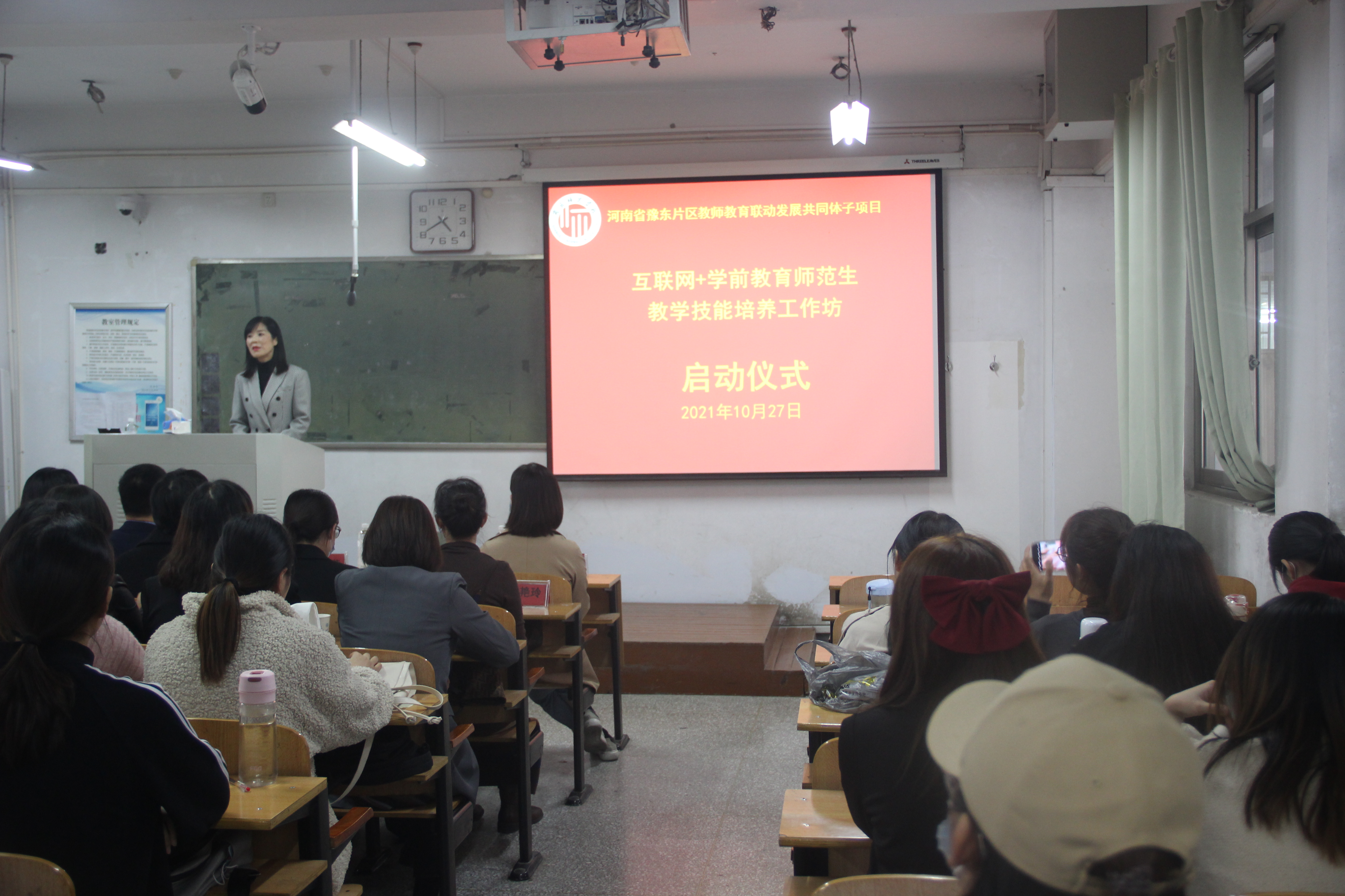 2021年10月27日下午,sunbet游戏官网于梁园校区智圆楼211教室举行“互联网+”学前教育师范生教学技能培养工作坊启动仪式。启动仪式由工作坊班主任李敏老师主持,参加人员有sunbet游戏官网副院长李战营、来自商丘市幼儿教育领域的12位一线名师和2019级学前教育专业全体学生。