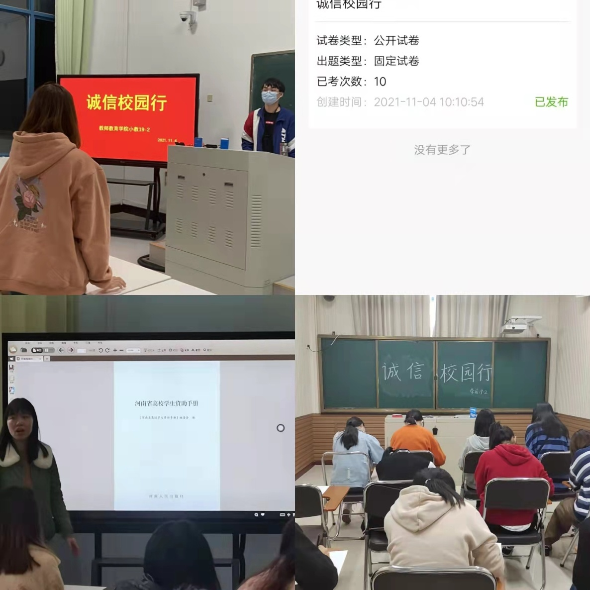 根据我校“诚信校园行”学生资助知识竞赛的通知要求,为帮助同学们了解国家奖助贷政策,增强同学们的诚信意识,sunbet游戏官网2019级学生以班级为单位于11月1日至11月10日在行方楼教室举行了“诚信校园行”活动。