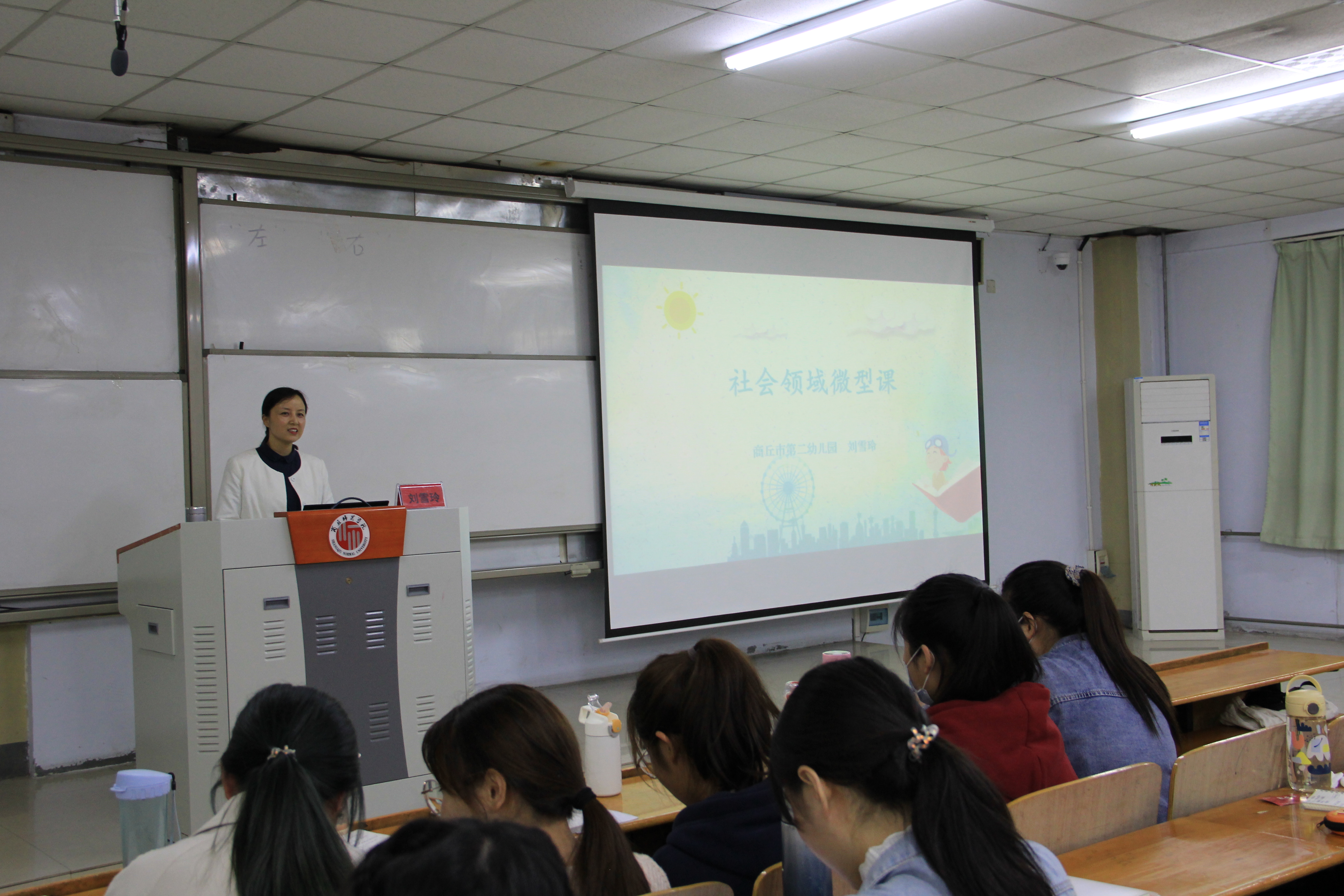 2021年11月6日sunbet游戏官网在智圆楼220教室举办“互联网+”学前教育社会领域微型课专题讲座,主讲人为商丘市第二幼儿园刘雪玲老师,参加人有工作坊班主任李敏、学前教育专业部分教师及2019级学前教育专业全体学生。