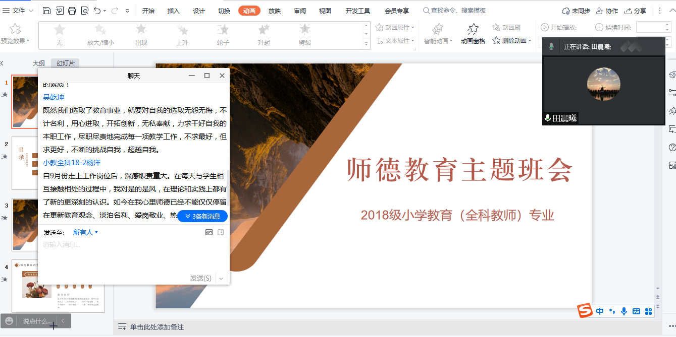 为进一步提高学生的师德修养,培养学生对教育事业的责任感、使命感,10月25日,辅导员田晨曦组织召开了师德教育线上主题班会。2018级小学教育(全科教师)专业全体学生参加。