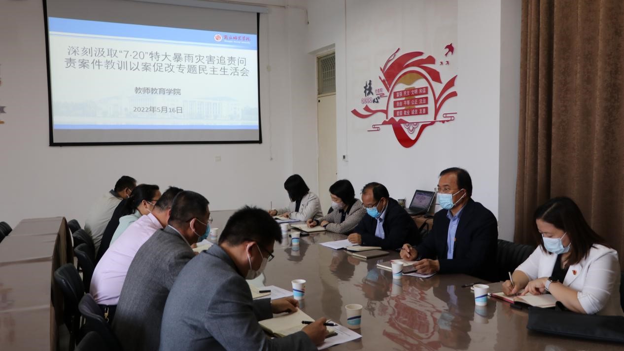 5月16日,sunbet游戏官网召开“7·20”特大暴雨灾害追责问责案件以案促改专题民主生活会。学校第八指导组长副校长郭文佳、统战部长黄蕾、第一监察室主任任鸿敏、第四指导组纪检委员李辉、信访案管科副科长金梦茹参加了会议。会议由sunbet游戏官网党委书记蒯秀丽主持。