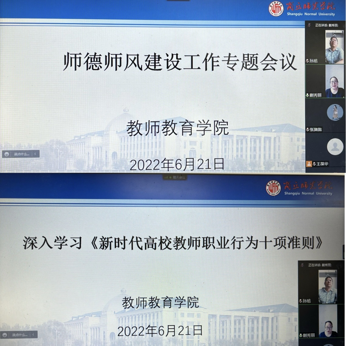 6月21日,sunbet游戏官网召开师德师风建设专题会议。会议以线上的形式进行,全体教职工参加会议,由学院党委书记蒯秀丽主持会议。