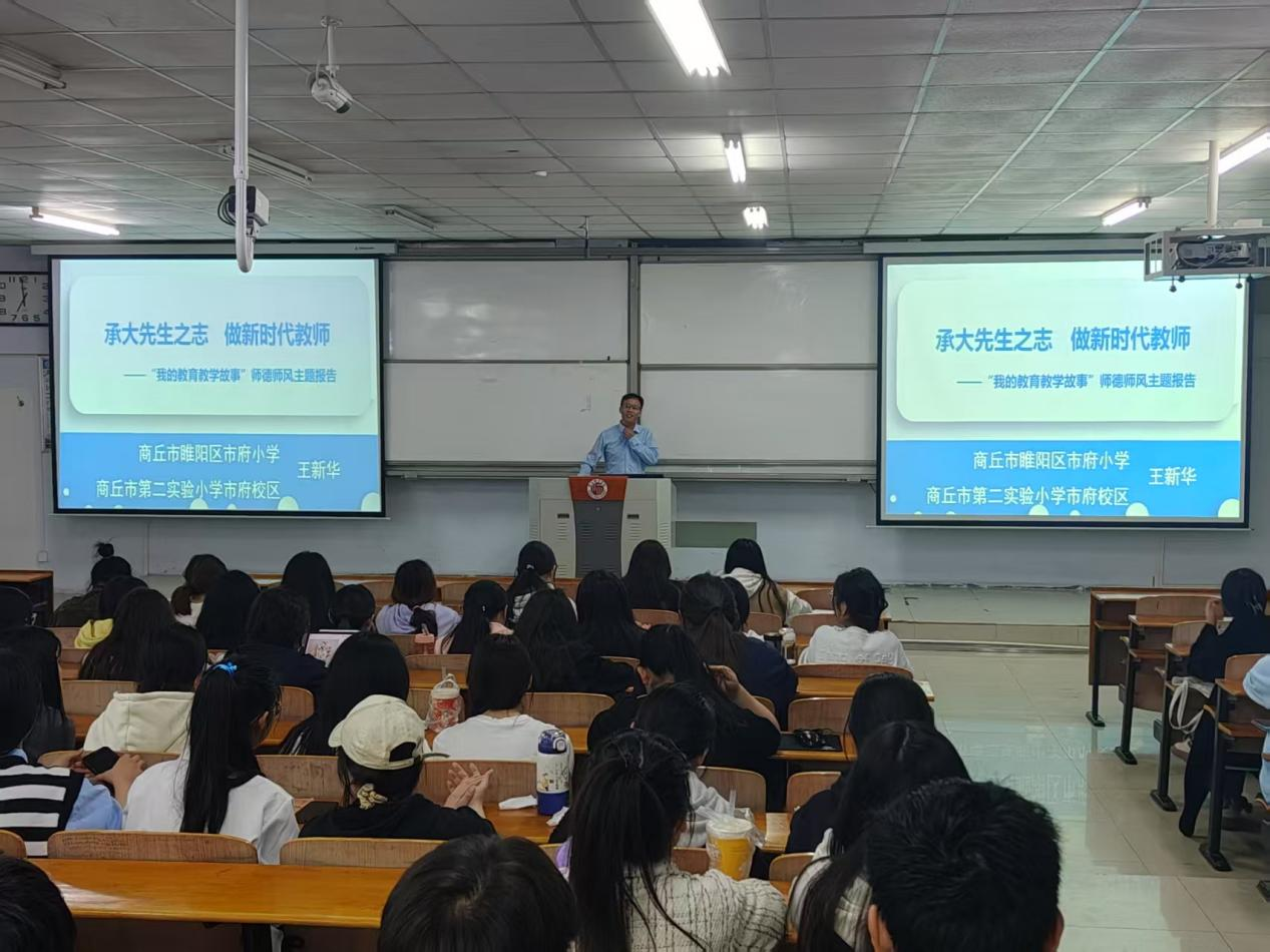 为深化师德师风建设,赋能师范生专业成长,3月26日,sunbet游戏官网举办“承大先生之志 做新时代教师”主题师德讲座。商丘市第二实验小学市府校区校长王新华应邀作专题讲座,为2022级小学教育专业全体学生带来一场直击教育本质的智慧启迪。